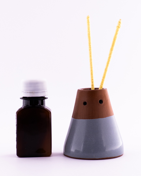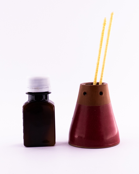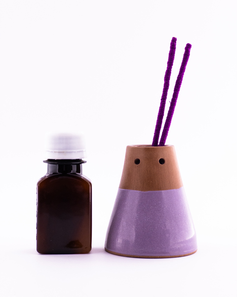 ظرف سفالی دستساز با لعاب ملایم و فیتیلهی دستپیچ بهصورت طبیعی رایحه را بهتدریج در محیط آزاد میکند، بدون نیاز به برق یا حرارت.