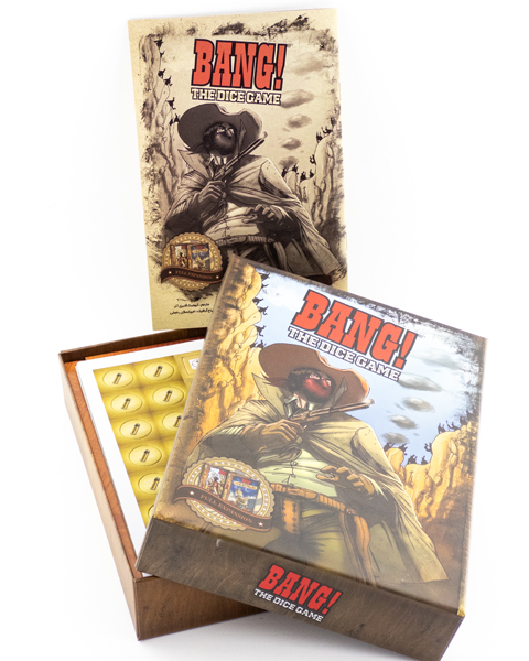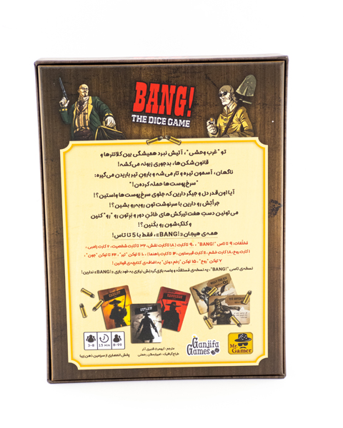 BANG! Dice Game نسخه تاسی، بازی هیجانانگیز استراتژیک برای 4 تا 8 نفر که به همراه افزونههای کافه قدیمی و زنده یا نامُرده تجربهای متفاوت از "غرب وحشی" را برای شما به ارمغان میآورد. 5 تاس، 30 کارت نقش و شخصیت و دهها انتخاب استراتژیک در این بازی انتظار شما را میکشد!
