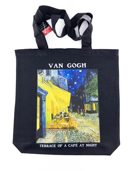 تتبگ مشکی با چاپ نقاشی «کافه تراس در شب» اثر ونگوگ – هنری، خاص، مناسب هدیه