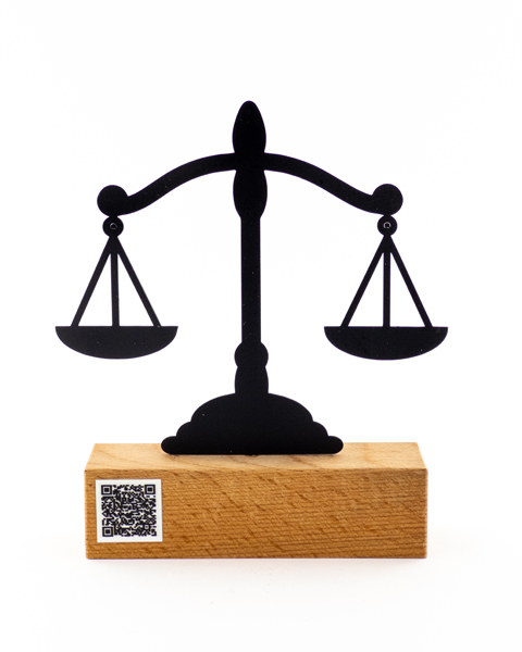تندیس فلزی ترازو عدالت با پایه چوب راش گرجستان و بارکد اختصاصی برای آپلود متن و موسیقی ویژه، هدیهای خاص و کاربردی برای وکلا و قضات جهت تزئین میز کار و ارتقای روحیه حرفهای.