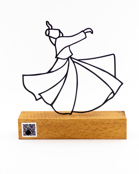 تندیس هنری رقص سماع، ساختهشده از فلز با پایه چوبی راش گرجستان، همراه با QR کد اختصاصی برای بارگذاری متن یا موسیقی دلخواه.