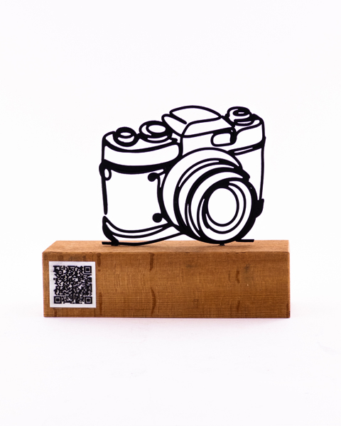 تندیس فلزی دوربین عکاسی با بارکد موسیقی، ترکیبی از هنر تصویری و صداست. روی پایهای از چوب طبیعی قرار گرفته و با اسکن بارکد، به قطعهای موسیقی متصل میشود. مناسب برای هدیه به عکاسان، هنرمندان و عاشقان خاطرهسازی.