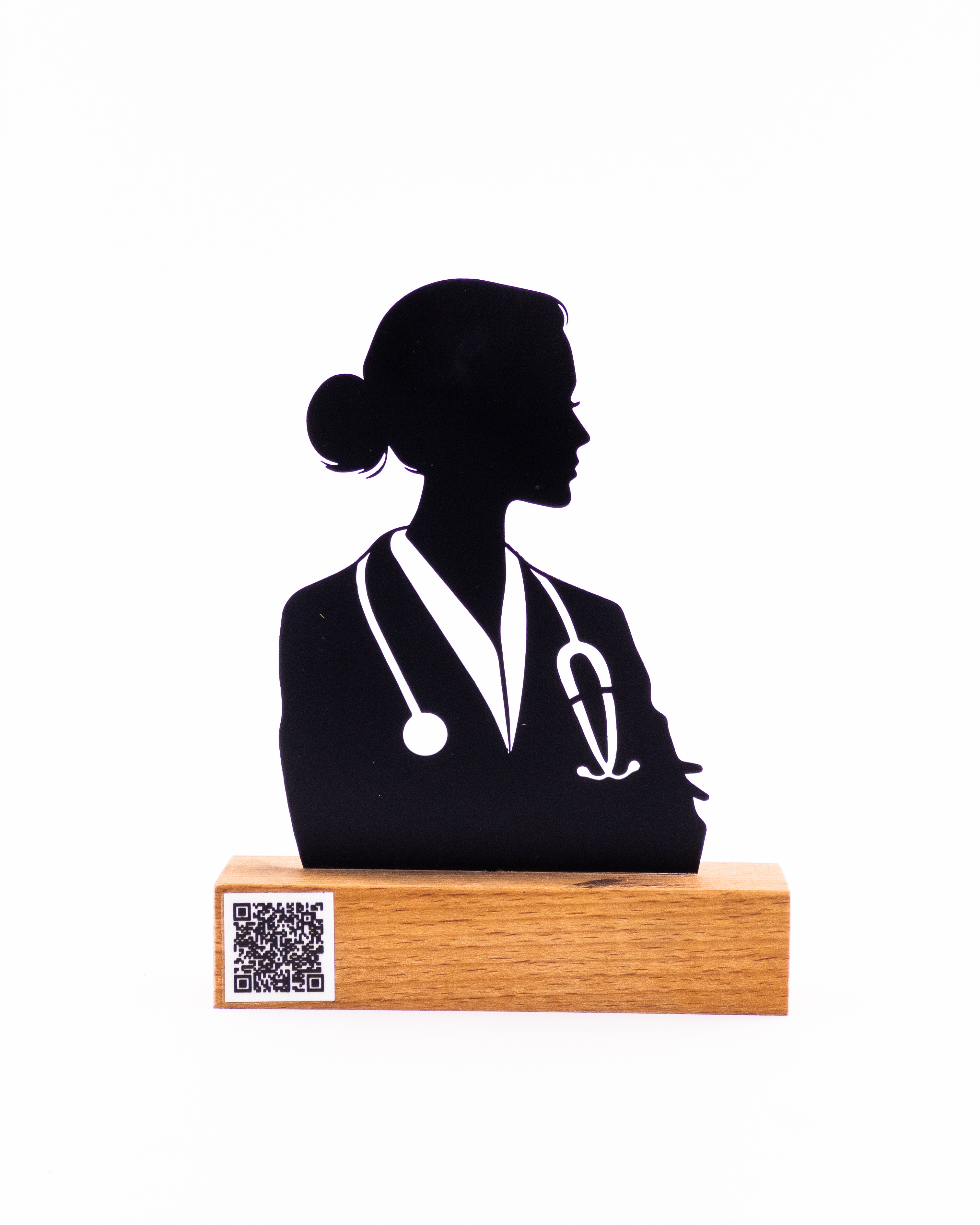 در جهانی که گاهی فراموش میکند چه کسانی بیوقفه برای جان انسانها تلاش میکنند، این تندیس فلزی با طراحی مینیمال و نمادین، ادای احترامیست به پزشکان و کادر درمان. سیلوئت پزشک با گوشی پزشکی، روی پایهای از چوب طبیعی قرار گرفته و با ظرافتی ساده، پیامی عمیق را منتقل میکند: «ما قدردان تو هستیم.»