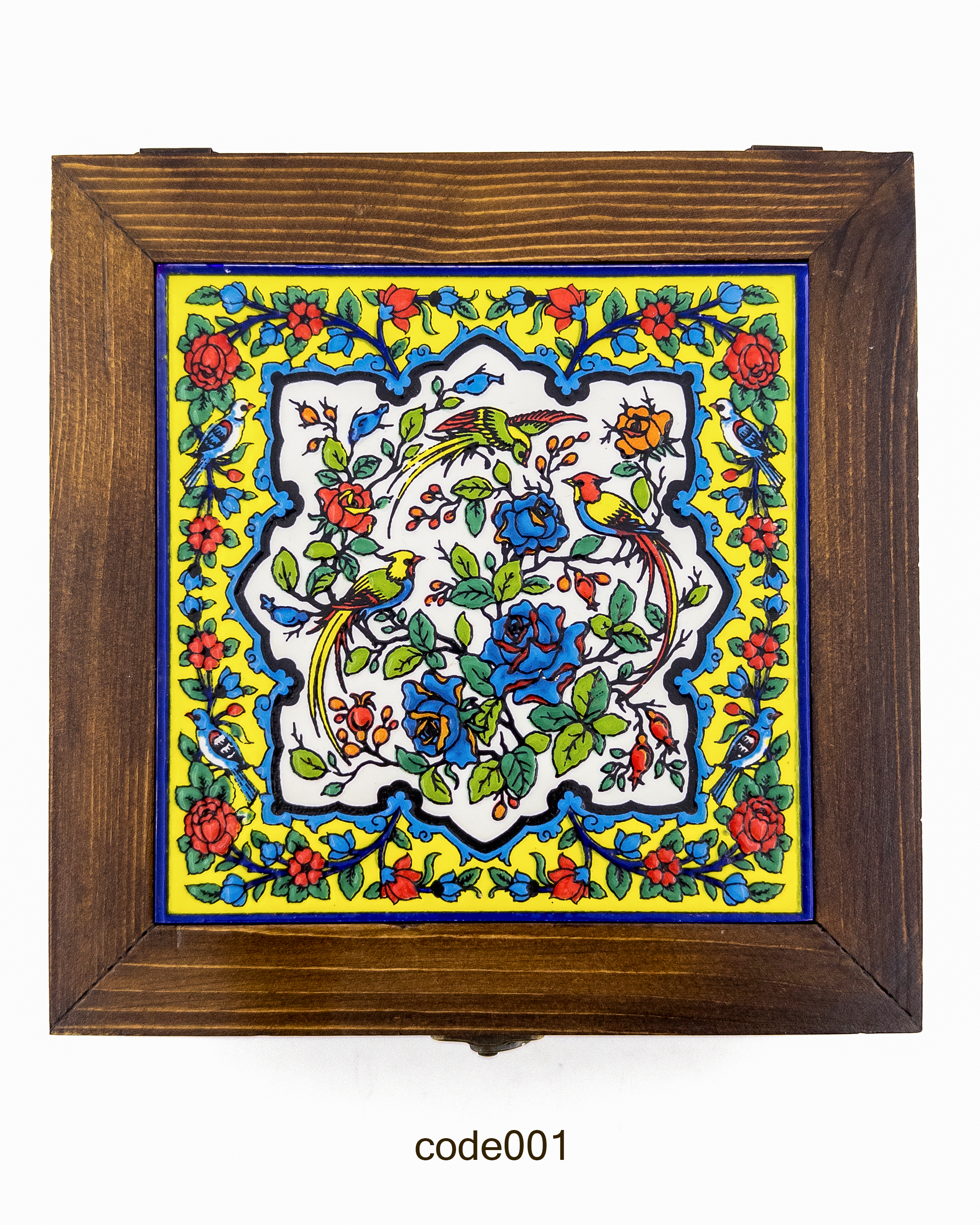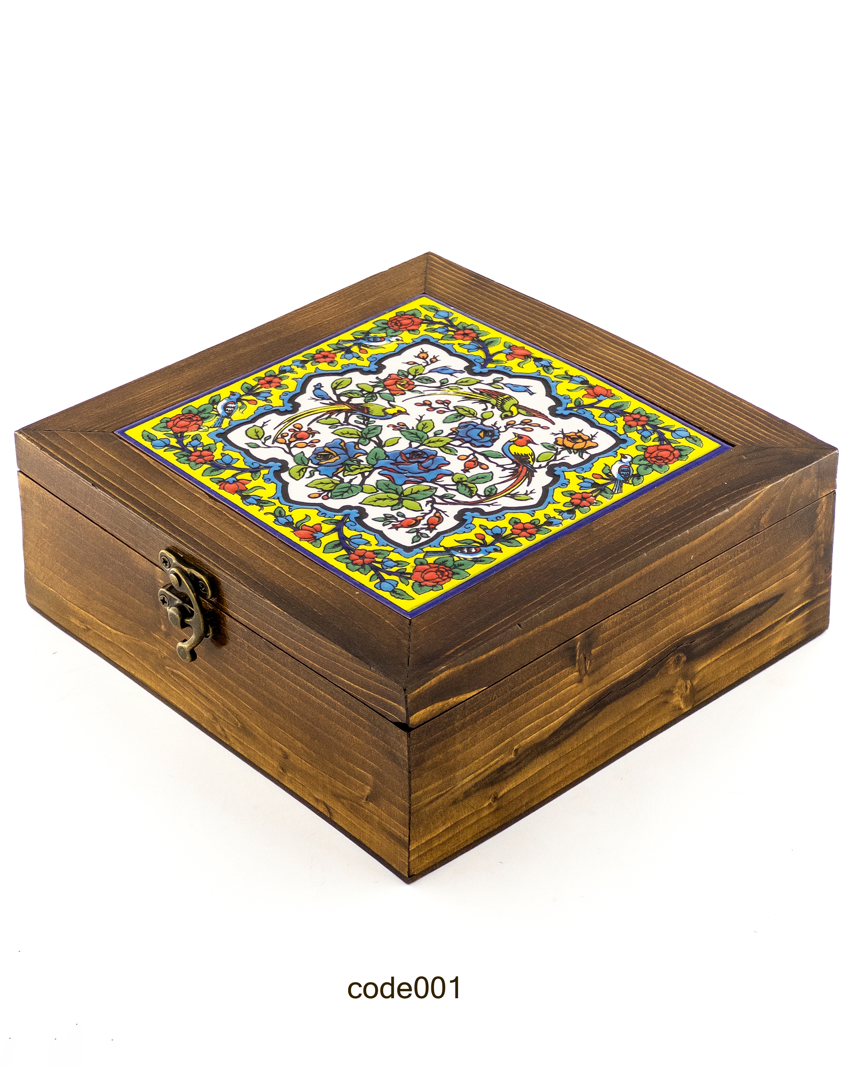 جعبه چوبی بزرگ دستساز با کاشی هفترنگ طرح گل و مرغ و حاشیه زرد– مناسب دمنوش، زیورآلات و هدیه