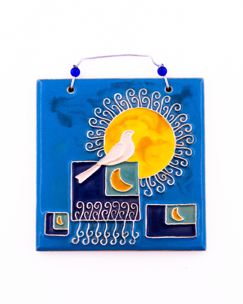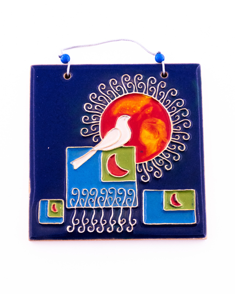 آویز خشتی دیوارکوب طرح پرنده و خورشید و ماه ترکیبی زیبا از عناصر طبیعت و کیهان است که با خلاقیت هنری و لعاب سنتی روی خشت دستساز نقش بسته است.