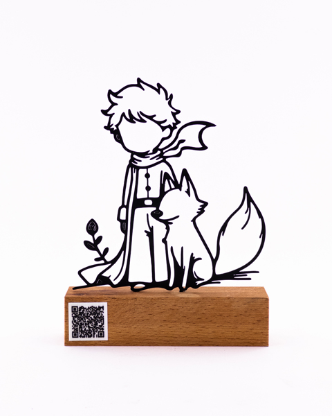 تندیس فلزی شازده کوچولو همراه با گل و روباه، ساختهشده با پایه چوبی راش گرجستان. اثری شاعرانه و فلسفی با بارکد اختصاصی برای آپلود متن یا موسیقی شخصی. هدیهای خاص برای هنرمندان، عاشقان ادبیات و دکورهای خاص رومیزی.