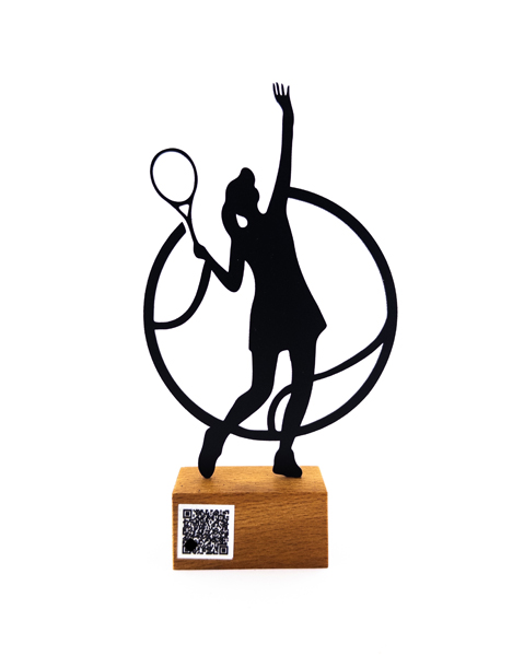تندیس فلزی زن تنیسور با طراحی مینیمال از توپ و راکت تنیس، روی پایهای از چوب طبیعی قرار گرفته و مجهز به بارکد اختصاصی برای بارگذاری متن و موزیک است. انتخابی خاص و الهامبخش برای دکوراسیون یا هدیهای ورزشی و مدرن.