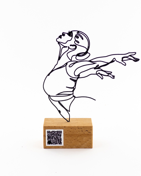 تندیس فلزی مدل زنی در حال پرواز تجسمی از هنر و خلاقیت با پایه چوبی راش گرجستان و QR کد