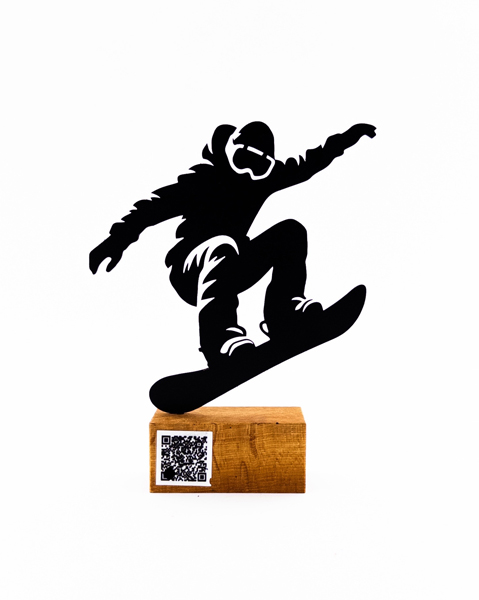 تندیس فلزی مرد اسنوبردباز در حال پرش روی پایهای از چوب طبیعی، مجهز به بارکد اختصاصی جهت بارگذاری متن و موزیک. انتخابی خاص و مدرن برای دکوراسیون یا هدیهای متفاوت و الهامبخش.