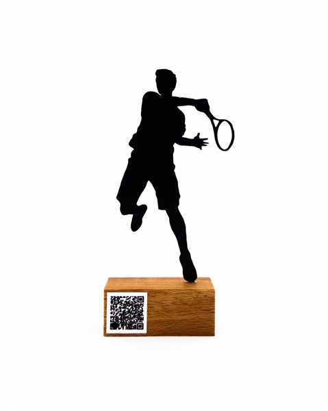 Metal Tennis Player Man Sculpture on Wooden Base with Unique Barcode