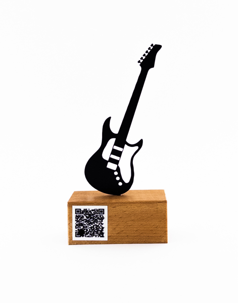 تندیس فلزی گیتار الکتریک با پایهی چوبی راش گرجستان، نمادی از انرژی، خلاقیت و شور موسیقی. همراه با بارکد اختصاصی برای آپلود متن یا موسیقی شخصی؛ هدیهای خاص برای نوازندگان و دوستداران موسیقی راک.