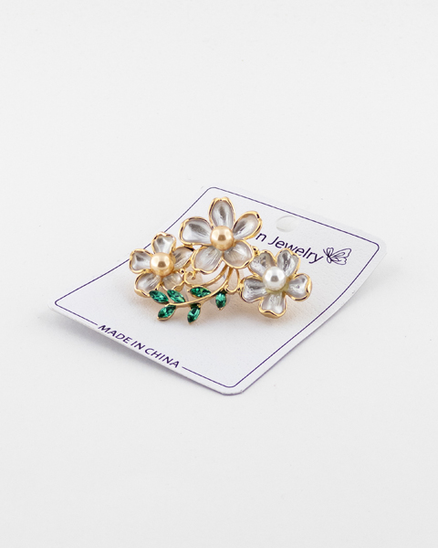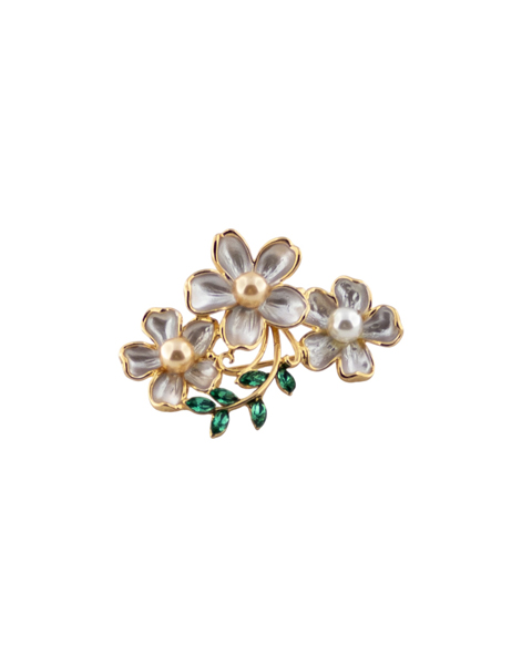 سنجاق سینهای ظریف با طراحی سه گل نقرهای و طلایی، تزئینشده با برگهای سبز مینایی؛ مناسب برای استایلهای روزمره و رسمی.