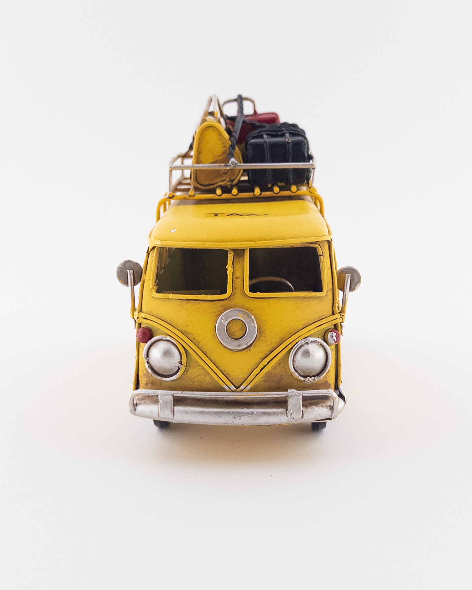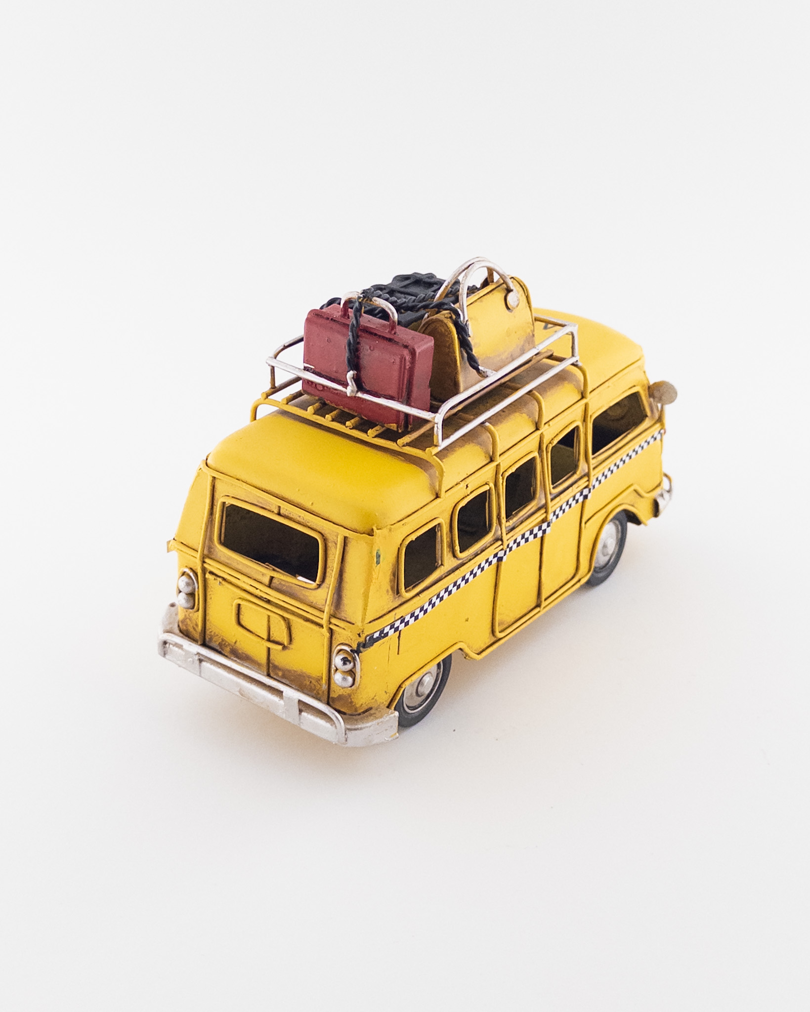 Handcrafted Yellow Volkswagen Van with Roof Rack, Bags & Suitcase | Travel-Themed Collectible