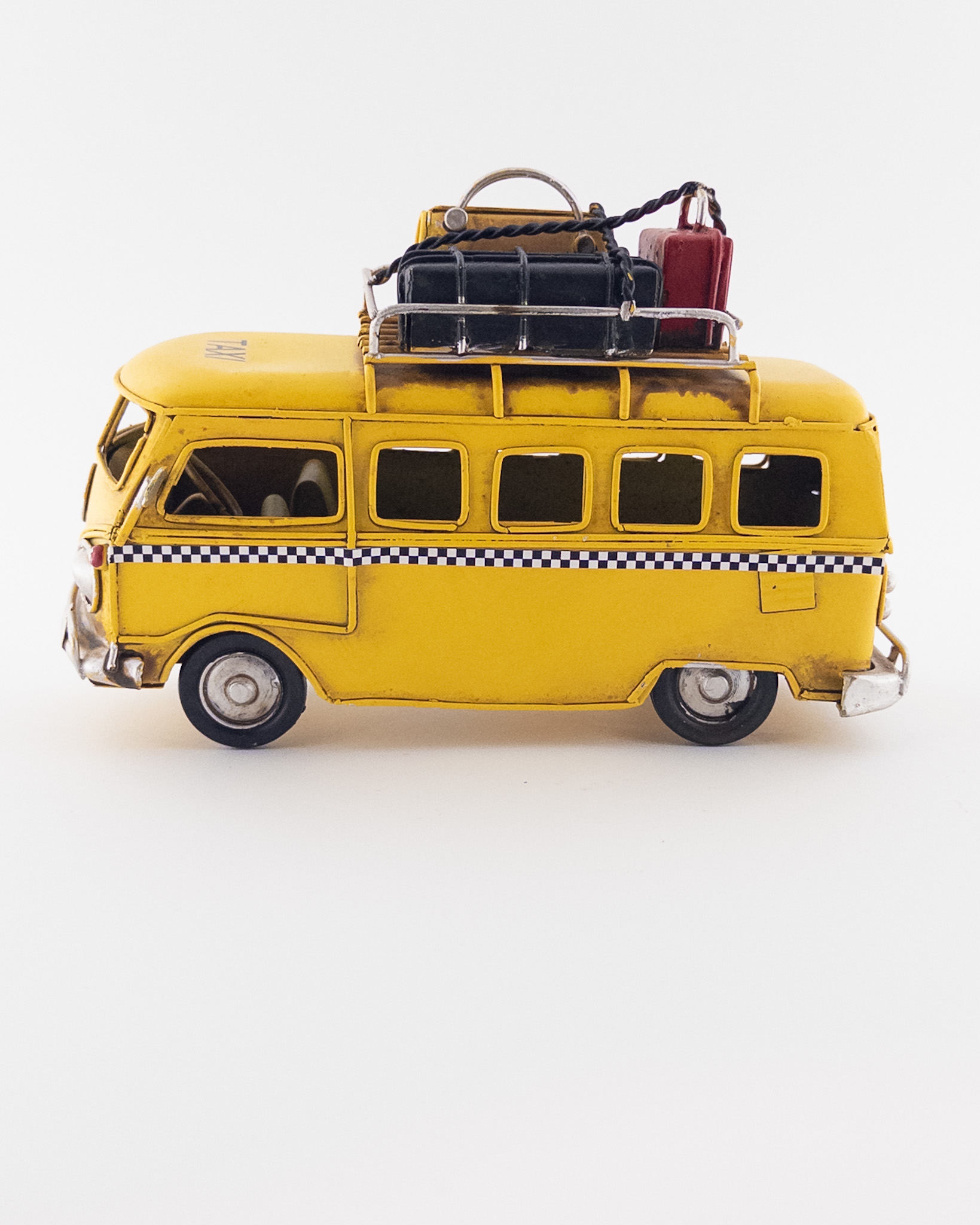 این ماکت ون فولکس زرد با الهام از مدلهای کلاسیک و خاطرهانگیز طراحی شده است؛ خودرویی که سالها نماد سفرهای جادهای و سبک زندگی آزادانه بوده است. رنگ زرد شاد و چشمگیر در کنار باربند سقفی که با ساک و چمدانهای کوچک تزئین شده، حس «عازم سفر بودن» را به زیبایی تداعی میکند.