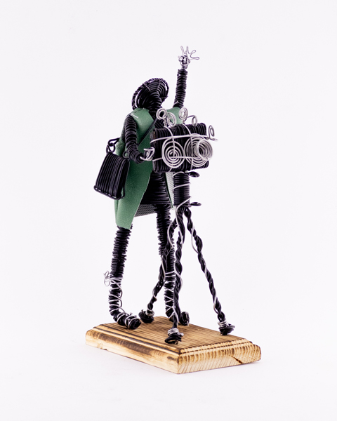 Handmade Wire Sculpture Photographer with Camera on Wooden Base