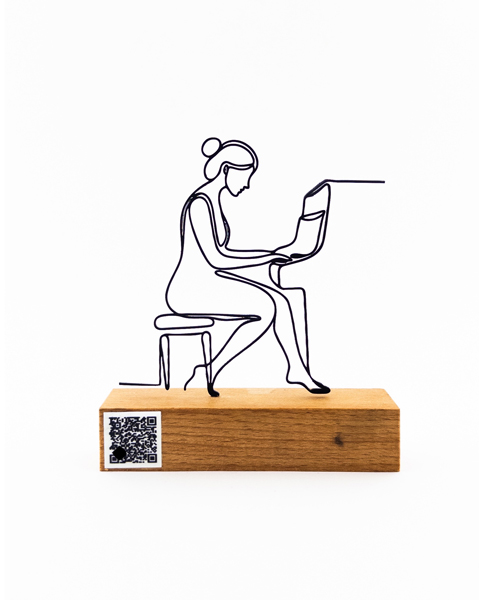 Female Pianist Sculpture with Metal Sheet on Wooden Base – Unique Barcode Edition