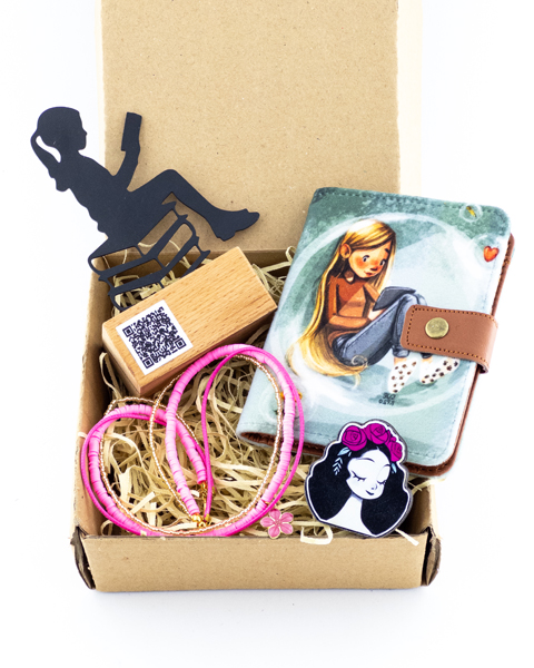 پک هدیه دختر کتابخوان – تندیس فلزی، چوکر، پیکسل و کیف پول با طرح کتابخوانی