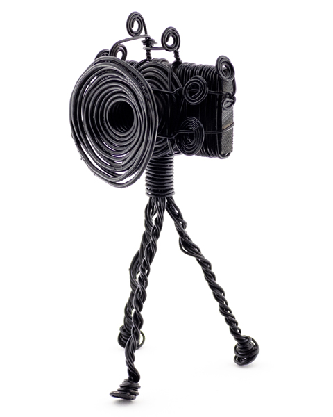 این دوربین مفتولی دستساز با ظرافتی خیرهکننده، فرم کلاسیک یک دوربین سهپایه را به شکلی هنری بازآفرینی کرده است. پیچوتابهای سیم سیاه به گونهای تنیده شدهاند که لنز، بدنه و پایهها را با دقتی بالا تداعی میکنند. این اثر همزمان هم تداعیگر نوستالژی عکاسی آنالوگ است و هم نمایانگر خلاقیت در استفاده از متریال ساده و صنعتی.