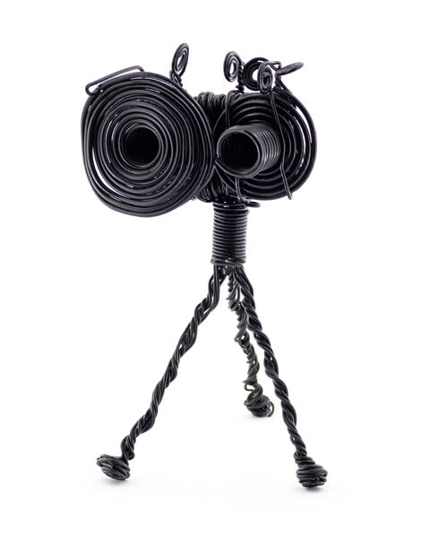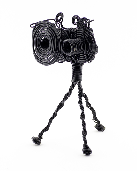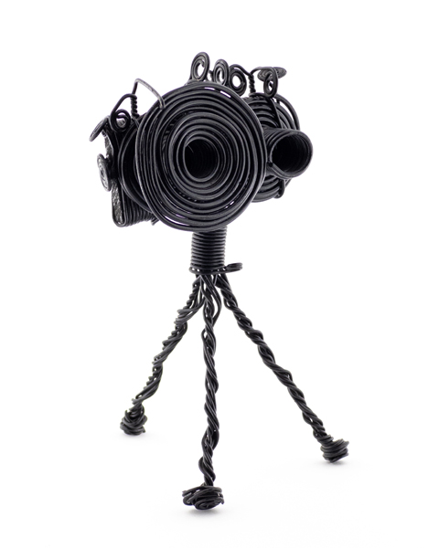 این دوربین مفتولی دستساز با ظرافتی خیرهکننده، فرم کلاسیک یک دوربین سهپایه را به شکلی هنری بازآفرینی کرده است. پیچوتابهای سیم سیاه به گونهای تنیده شدهاند که لنز، بدنه و پایهها را با دقتی بالا تداعی میکنند. این اثر همزمان هم تداعیگر نوستالژی عکاسی آنالوگ است و هم نمایانگر خلاقیت در استفاده از متریال ساده و صنعتی.