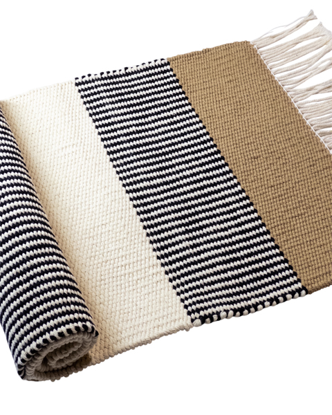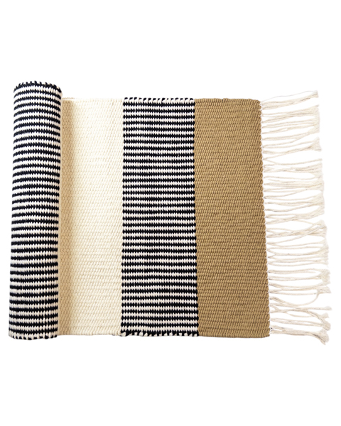 رانر و رومیزی مستطیلی دستساز با نخ پنبه طبیعی، رنگ سفید، شتری و مشکی – مناسب دکور بوهو و مینیمال