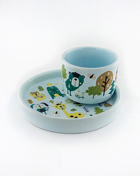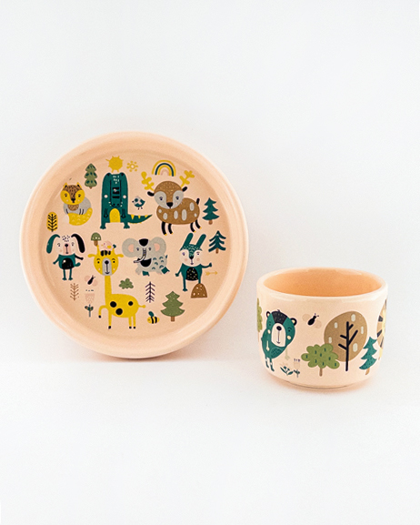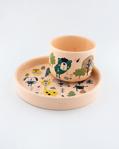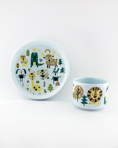 ست ظرف غذای کودک سرامیکی طرح حیوانات جنگل – بشقاب لبهدار و فنجان فانتزی