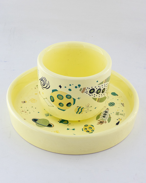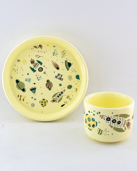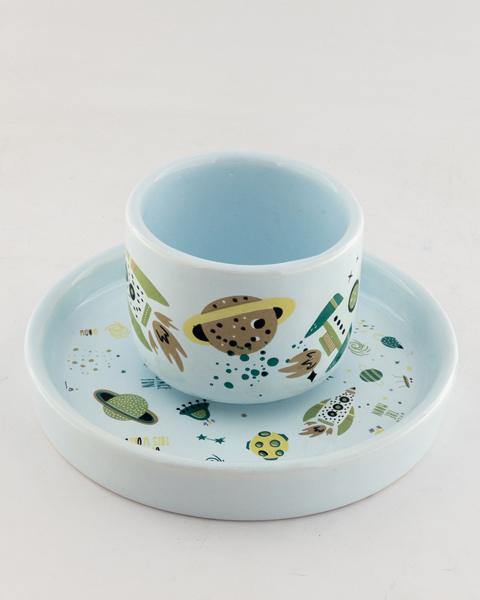 ست ظرف غذای کودک سرامیکی طرح فضا و فضانورد و سفینه– بشقاب لبهدار و فنجان