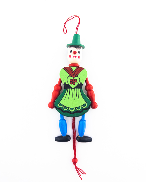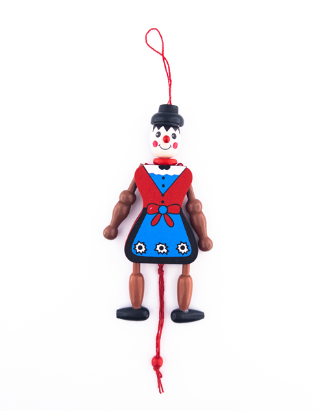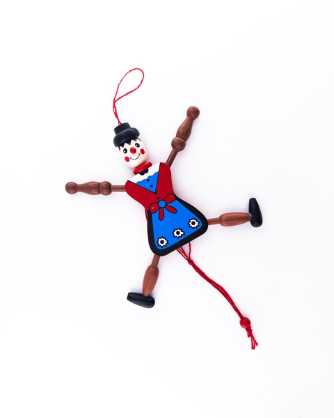 عروسک چوبی دلقک آویزی، با طراحی فانتزی و رنگهای شاد، با کشیدن نخ از پایین، دستان و پاهایش را به حرکت درمیآورد. ترکیبی از بازی، دکور و نوستالژی برای کودکان و بزرگسالان.