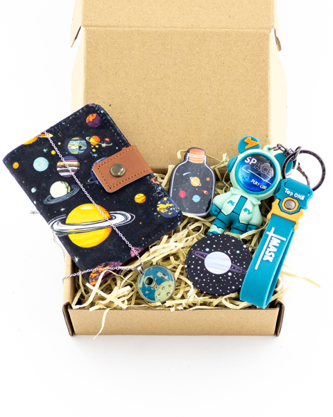 یک پکیج کامل و خاص برای علاقمندان به فضا و کهکشان، شامل جاسوویچی طرح فضانوردی، پیکسل فضا، گردنبند شبتاب و کیف پول با طرح سیاره که هرکدام حال و هوای کیهانی دارند.