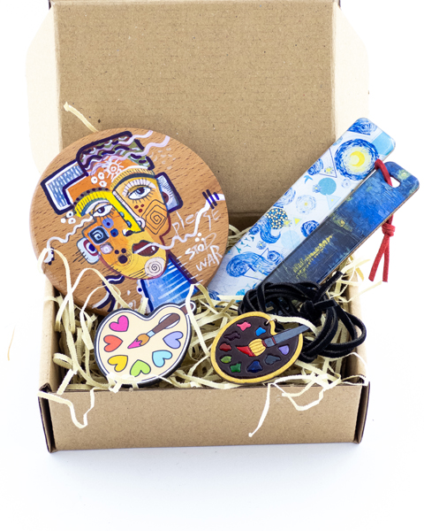 - اجزای داخل پک: بوکمارک ونگوگ، گردنبند پالت نقاشی، پیکس پالت و نقاشی روی چوب با طرح کوبیسم