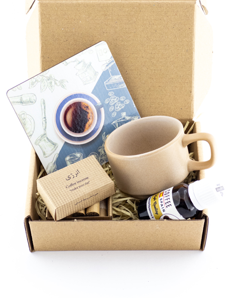 - اجزای داخل پک: زیرلیوانی- اسانس قهوه- عود دستساز قهوه-فنجان اسپرسو