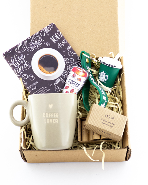 مجموعهای خاص برای دوستداران قهوه شامل فنجان قهوه دستساز، جاسوییچی طرح ماگ استارباکس، زیرلیوانی، عود دستساز با رایحه قهوه و پیکسل زیبا.