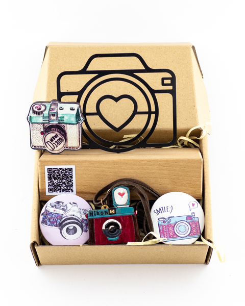 - اجزای داخل پک: مجسمه چوبی دوربین، جاکارتی، استیکر، بوک مارک با طرح خرس، زیر لیوانی، پیکسل، گردنبند فلزی دستساز، کبریت رنگی، جاکلیدی، شکلات، شیشه دکوری با چوب پنبه