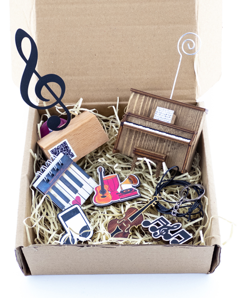 هدیهای خاص و شخصیسازیشده برای موزیسینها: شامل تندیس نت سل با قابلیت بارگذاری متن و موزیک، گردنبند ساز، پیکسل، جاسوییچی، دفترچه یادداشت و هولدر چوبی.