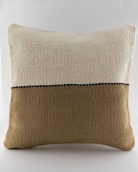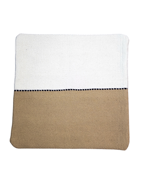 کوسن دستساز مربع ۴۵ سانت دو رنگ سفید و شتری – دکور مینیمال و بوهو