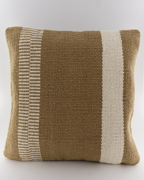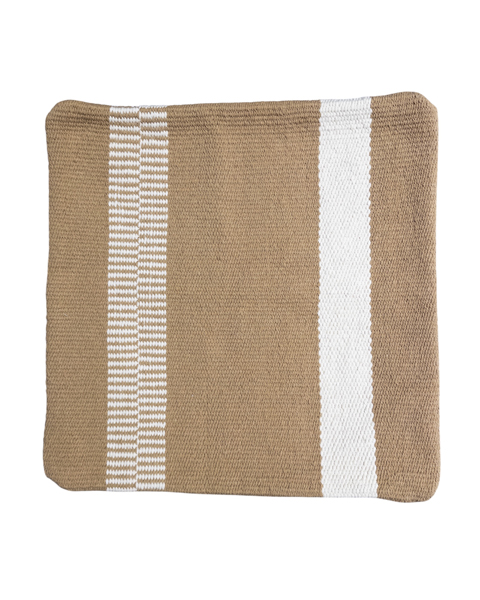 کوسن دستساز مربع ۴۵ سانت سفید با ترکیب رنگ گرم شتری – دکور مینیمال و بوهو