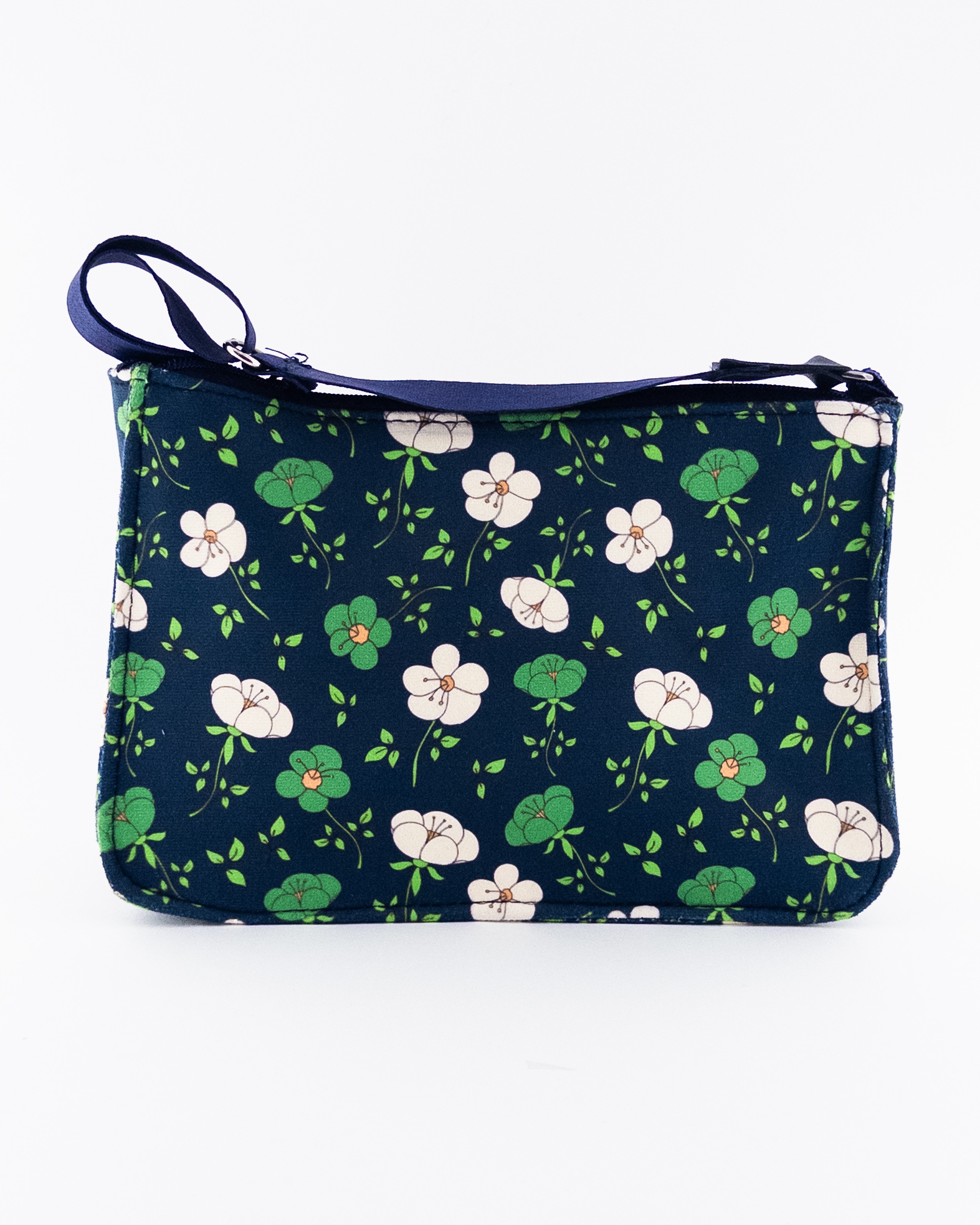 کیفی سبک و لطیف با شکوفههای سفید روی زمینه سرمهای؛ مناسب برای حمل وسایل ضروری، استایل روزمره یا هدیهای شاعرانه برای سلیقههای ظریف.
