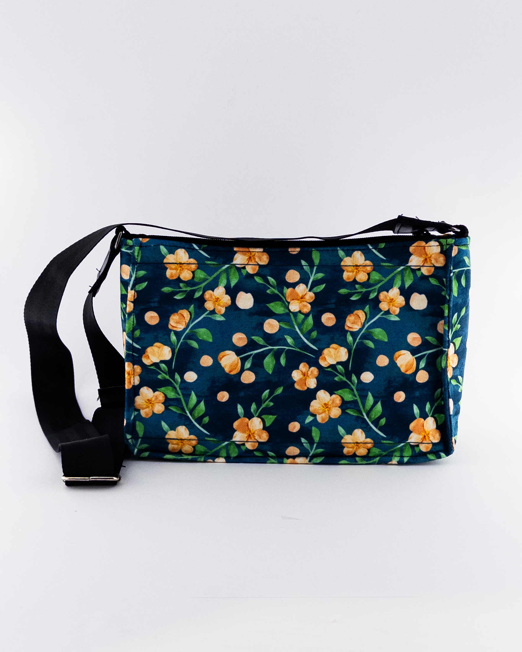 کیفی لطیف و چشمنواز از جنس مخمل، با گلهای نارنجی روی زمینه سرمهای؛ مناسب برای استایلهای هنری، روزمره یا هدیهای خاص برای سلیقههای رنگی و منحصربهفرد.