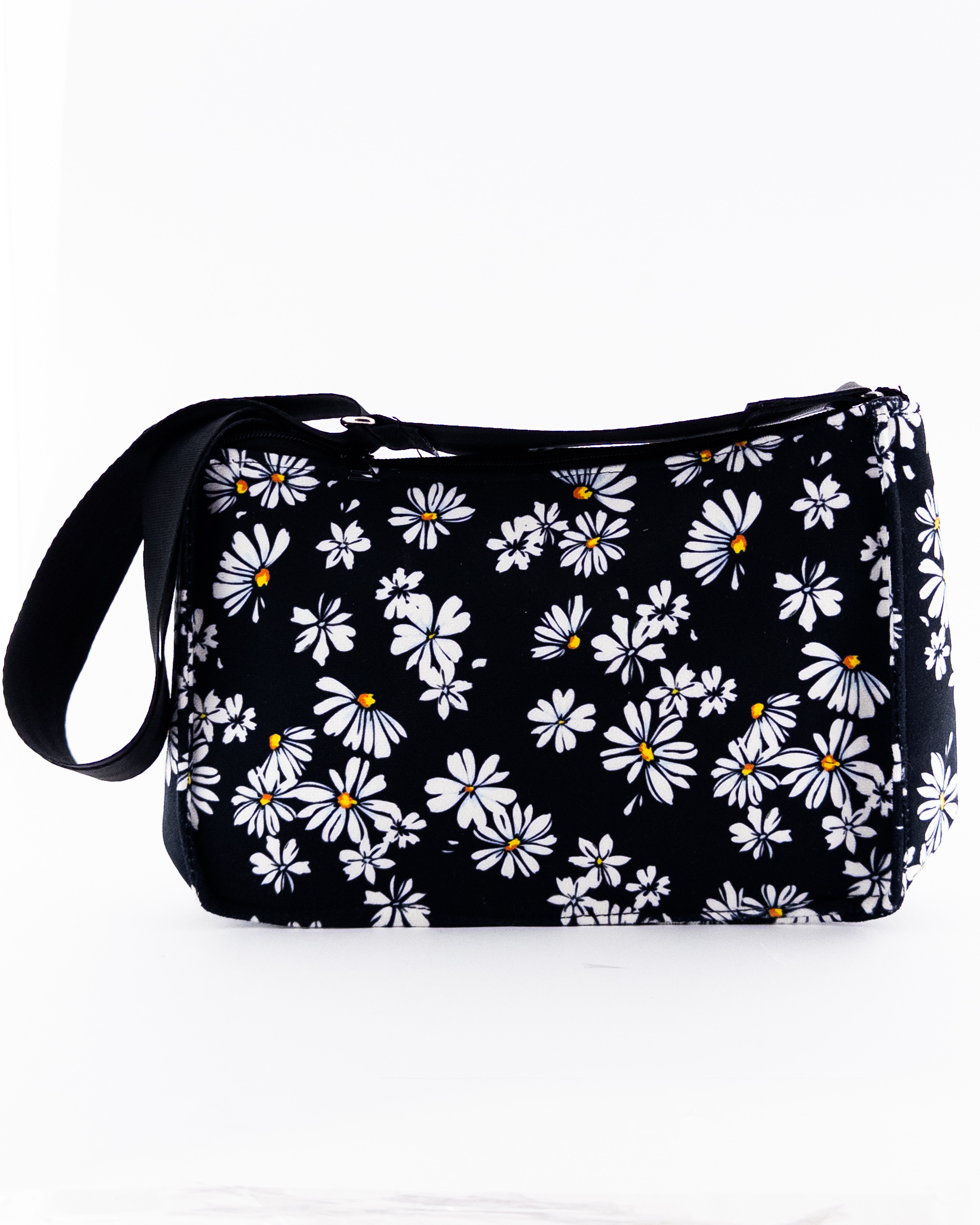 کیفی از جنس مخمل مشکی با گلهای سفید و زرد؛ ترکیبی از لطافت، تضاد رنگی و حس طبیعت. مناسب برای استفاده روزمره، استایلهای مینیمال یا هدیهای خاص.