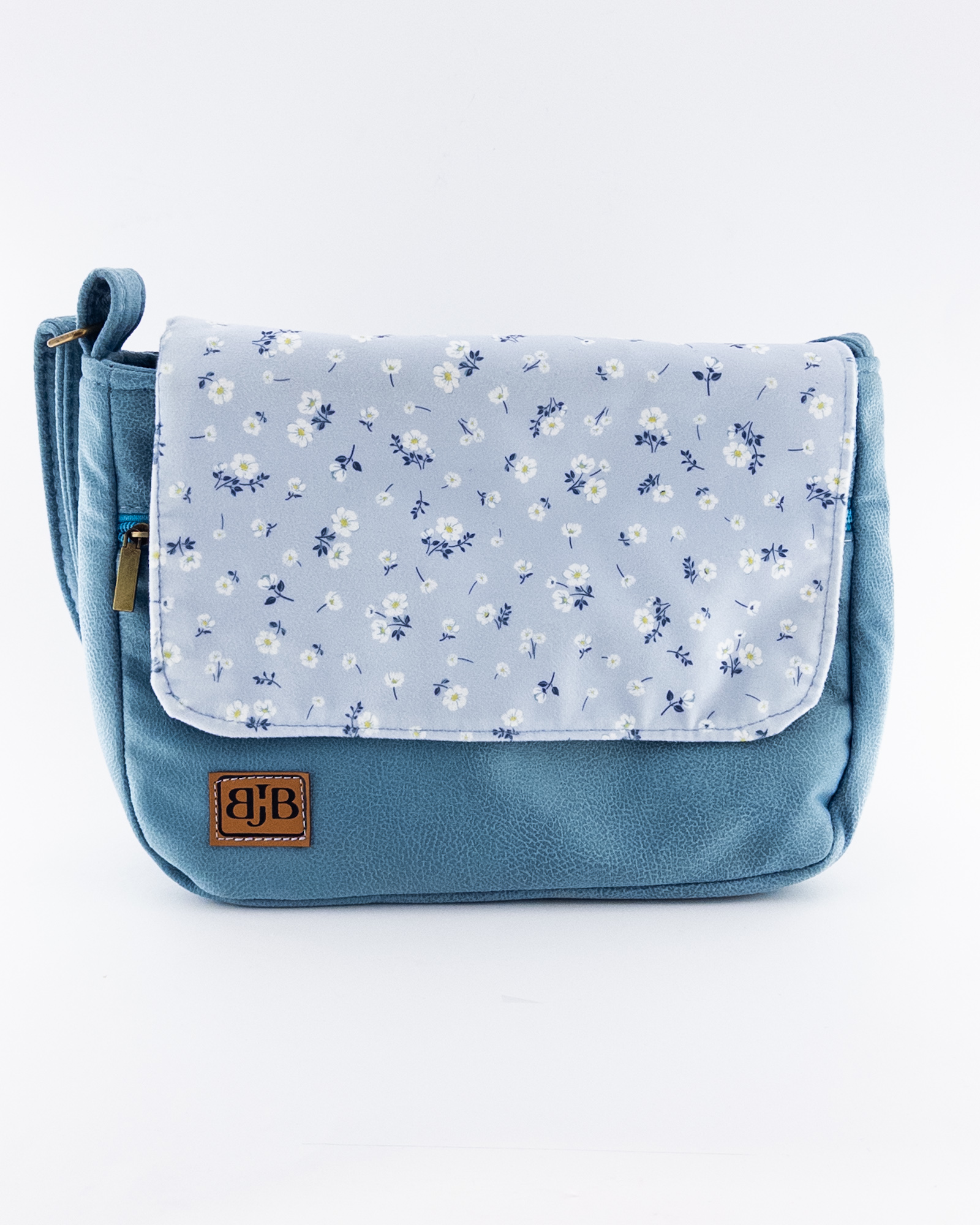 Handmade Velvet Shoulder Bag – Soft Blue Base with Delicate White & Blue Floral Flap